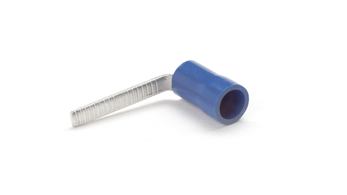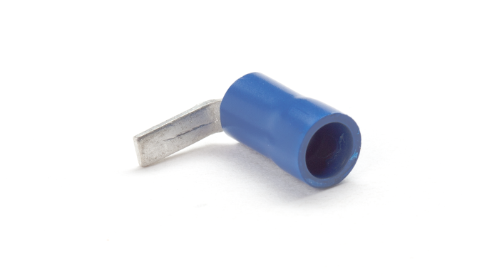 Red, Blue and Yellow PVC insulated Copper right angled blade terminals for terminating multi-stranded copper cables and wires 0.5mm2 to 6mm2 , Temperature rating -20⁰C to +75⁰C , Maximum Voltage 600V.