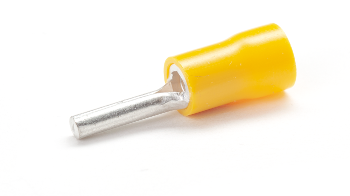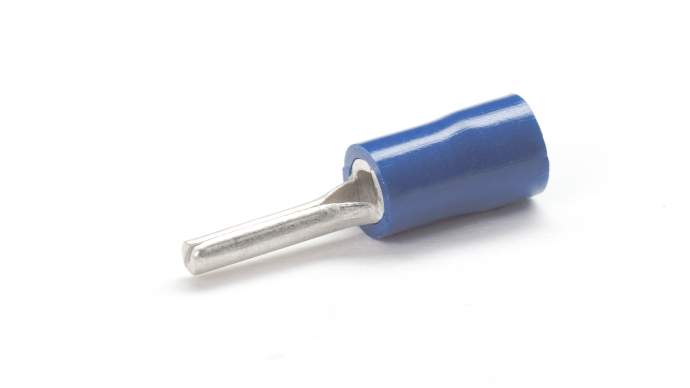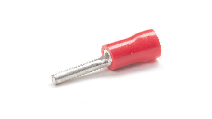 Red, blue and yellow PVC insulated copper pin terminals for terminating multi-stranded copper cables and wires 0.5mm2 to 6mm2 , Temperature rating -20⁰C to +75⁰C , Maximum Voltage 600V.