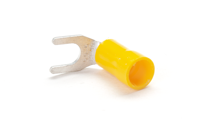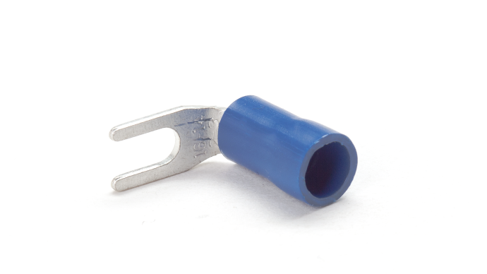 Red, Blue & Yellow PVC insulated, Right Angled Copper fork terminals for terminating multi-stranded copper cables and wires 0.5mm2 to 6mm2 , Temperature rating -20⁰C to +75⁰C , Maximum Voltage 600V.